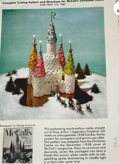 In looking for something totally different, I came across this pattern on eBay. I couldn’t really tell from the thumbnail what it was, but then I realized — it’s a castle built from mini-marshmallows! The pattern has templates to cut cardboard as the base, then you apply minis or dinner mints to create the effect. I’ve seen so many patterns over the years, but I’ve never seen one made from something edible! Is this a one-off, or have you ever seen something like this from a pattern (not a recipe)?