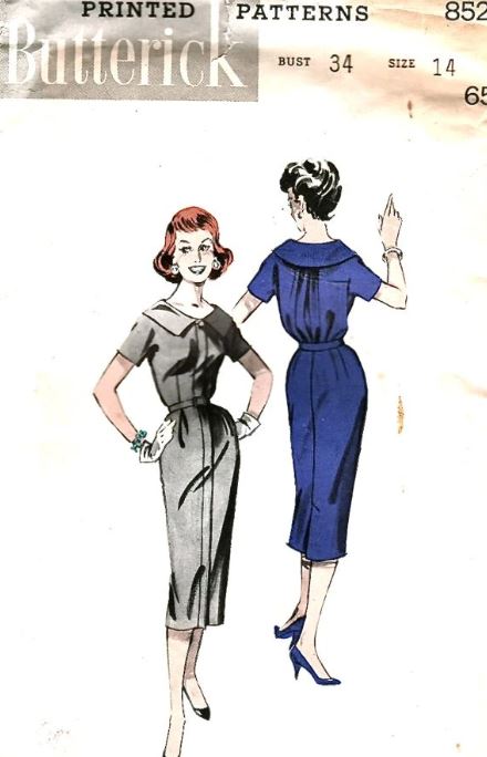 The pattern I have is a shirtwaist dress with pleated bodice and skirt, and falls below mid knee. The hairstyle is similar to this one, so it can’t be thirties, and since fabric rationing was throughout the forties in the UK, I figured it was, at earliest, 1950. That’s how I found this one.